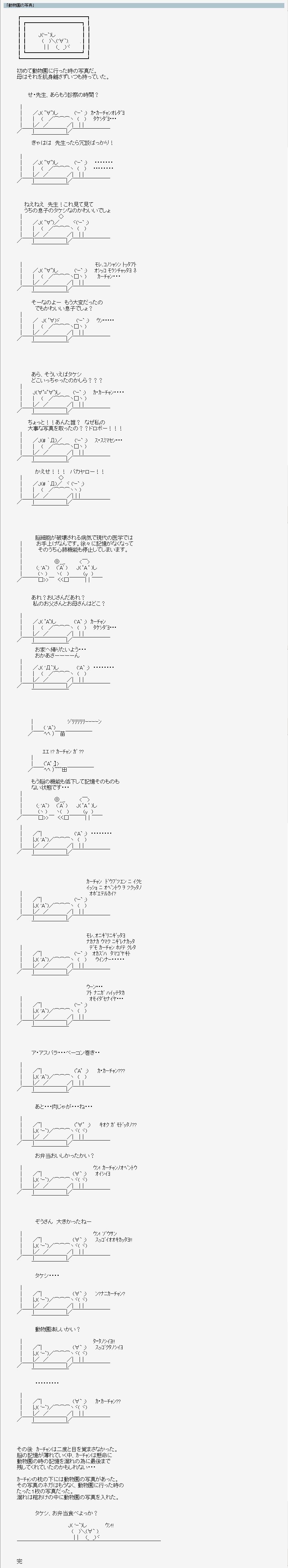 がんで入院したのですが 入院してすぐ、記憶に障害が… 食事したことも忘れて… でも、昔のことはよく覚えていました 脳の調子が良いときと悪いときがあって でもだんだん、いい時が少なくなって… 主人は男だけの兄弟で 義姉(兄嫁)と私が毎日病院に顔を出して 様子を見ました 主人も義兄も、義母の様子を見るのがつらかったのかもしれません 子供のころの動物園 お母さんと息子さんの大切な思い出なんでしょうね